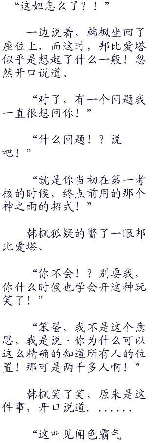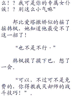 征服系统的事情韩枫是不会说的,而且说了邦比爱塔估计又认为自己是在耍她!
