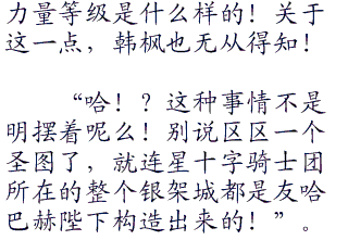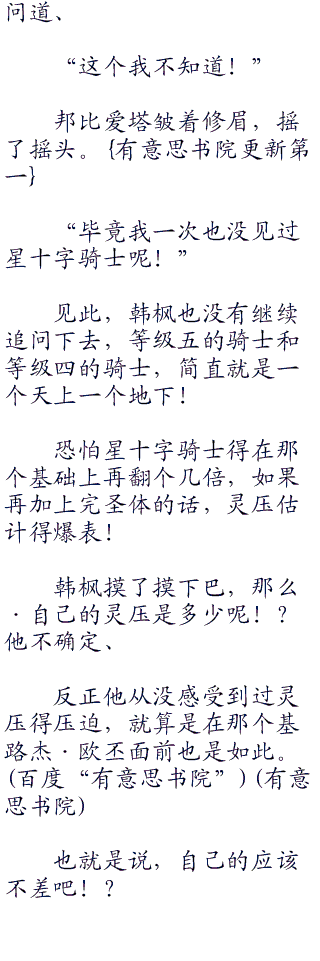 “你那天没发现么!?真是怪胎,这么说吧,如果他全力释放自己的灵压的话,可以让任何一名见习骑士站不起来!一般状况下能够感受到的灵压就是将近左右,全力之下的,至少得翻个十倍!”