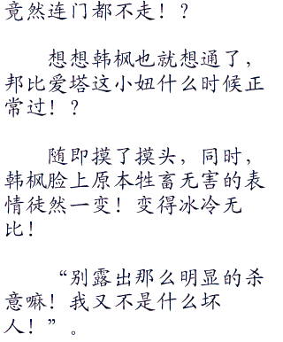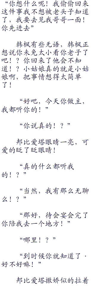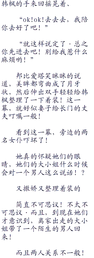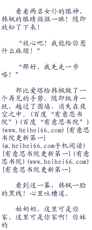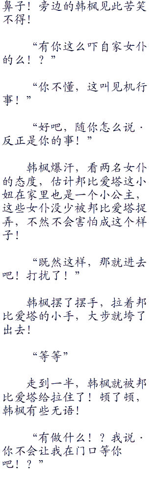 邦比爱塔故意提高了嗓门狠狠的瞪了两名女仆,吓得两名女仆大气都不敢喘一下!