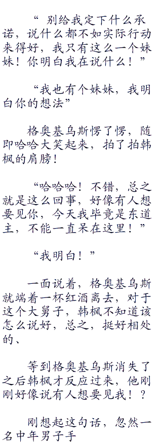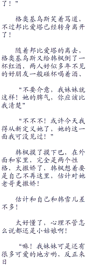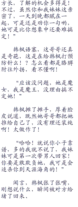 “嘛!怎么样都好,反正差不多就把话放在这里而来,其实我挺满意的至于老爹那面!我可管不了!”