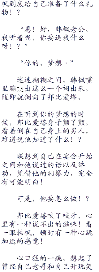 迷迷糊糊之间,邦比爱塔这才听清楚韩枫说的话,眨了眨眼睛!随即想起了之前韩枫离开的时候说的话,送自己礼物!