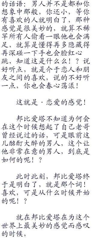 邦比爱塔她都知道的,现在自己怀里这个醉得像一个孩子一样的男人都是为了自己,都是为了自己不被别人欺负而已!