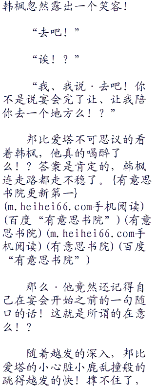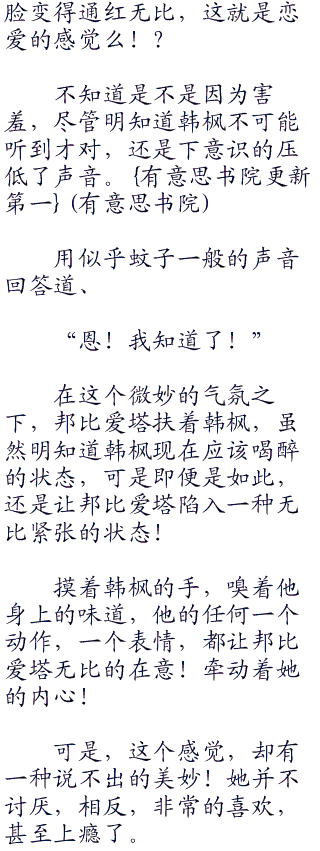虽然知道现在韩枫是喝醉的状态,但是听到韩这么说,邦比爱塔还是有些小害羞,小脸闪过一丝的红润!