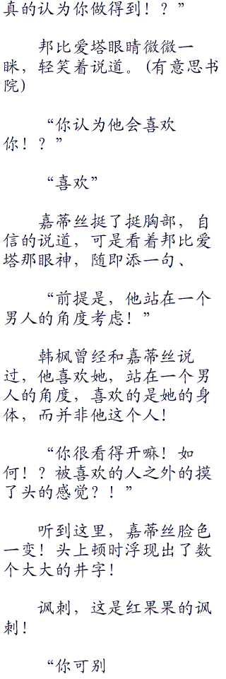 邦比爱塔抬头望着嘉蒂丝,笑了笑!随即指了指躺在自己腿上的韩枫!