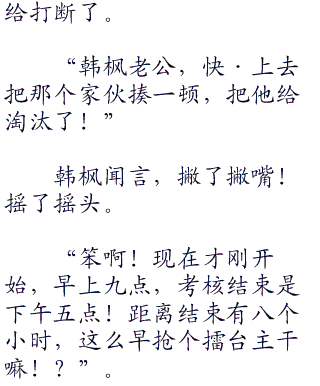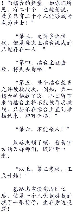 “第一,现在的时间是上午九点,到下午五点为止,只要是站在擂台上的人将会是合格者!”