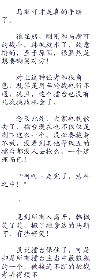 看到韩枫上来,擂台主怔了怔,露出惊讶的表情,同时在犹豫要不要弃权!