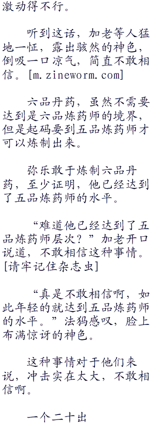 如今,弥乐已经达到了五品炼药师的水平,如果有异火帮助的话,就算炼制六品丹药,不是没有成功的可能,只是成功的几率比较小,比五品丹药还要小上一些。