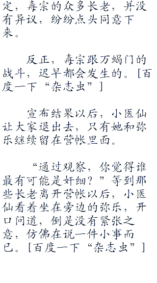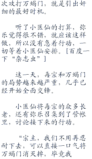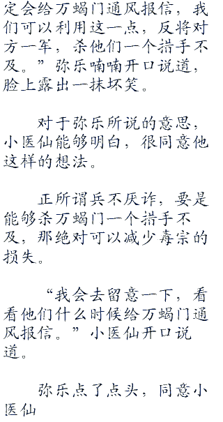 小医仙已经得到消息,可能因为魂殿使者怂恿,所以万蝎门已经蠢蠢欲动,想要击溃毒宗,成为出云帝国最强的宗门。