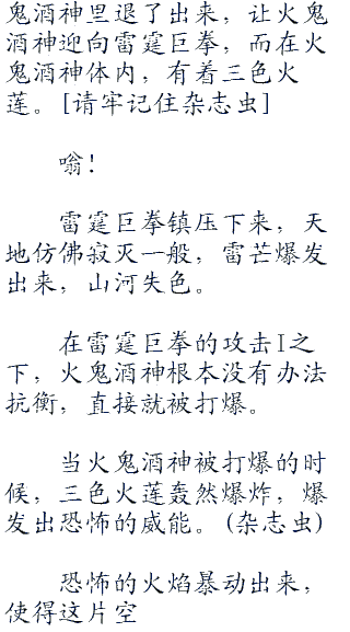 弥乐并没有停止动作,把三种异火全部释放出来,环绕在火鬼酒神周围,将火鬼酒神映衬得,宛如一尊魔神,看起来十分恐怖。