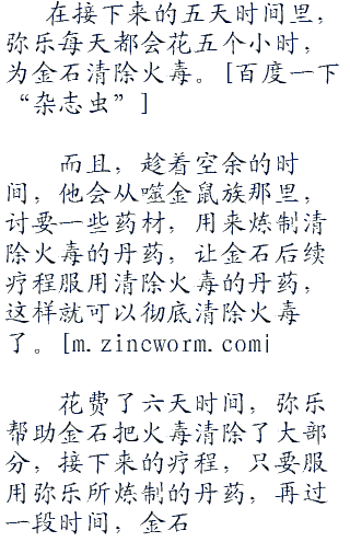 第一天时间,弥乐花费了五个小时,为金石清除火毒。