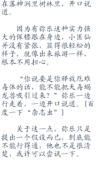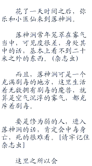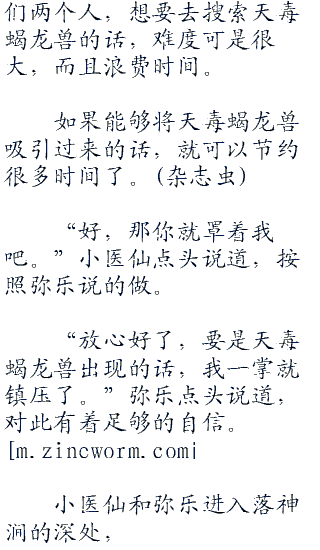 接下来,弥乐要做的事情,就是和小医仙前往落神涧,夺取七阶天毒蝎龙兽的魔核,帮助她凝聚毒丹,控制住厄难毒体。