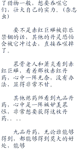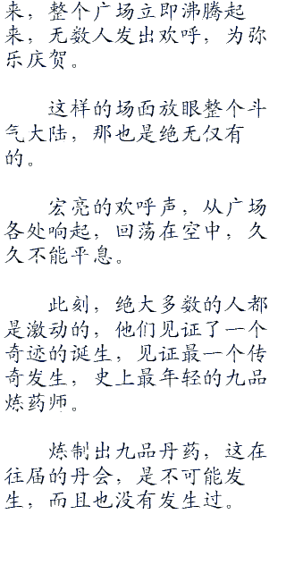 萧炎虽然炼制出了八品高级丹药,处于第二名,但是却一点高兴不起来,因为还有一座大山ya在他的肩膀上。
