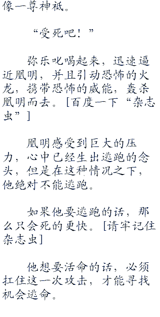 被弥乐这般挑衅,凰明心中不爽,心中怒气翻腾起来,恨不得将对方轰杀。