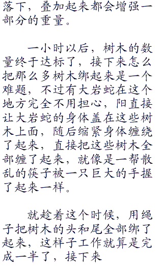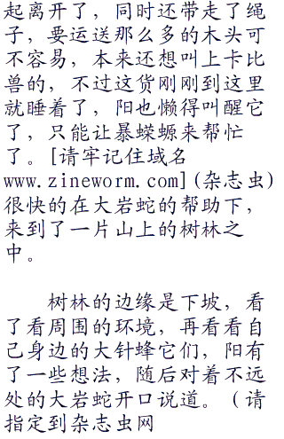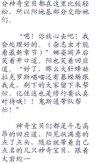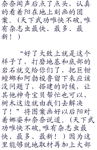 “好了,就在这里吧!不过因为要三个星期的时间,用帐篷的话可能不太可靠,所以我们今天的第一件任务就是,搭建一座房屋!!”这里的空地够大,所有的神奇宝贝在这里也不会显得很挤,不过三个月的时间,天气变幻莫测,只是用帐篷的话可能不太方便,所以阳决定先搭建房屋。