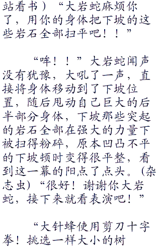 “那么大岩蛇这段时间也要拜托你了哦!”见奈奈明白以后,阳也没有再说什么,转过头来对着大岩蛇说道。大岩蛇闻声眯着眼睛点了点头,大岩蛇比较熟悉这个大山的环境,最重要的是大岩蛇的实力很强,而且防御力惊人,用来做对战练习的对手是再合适不过了。