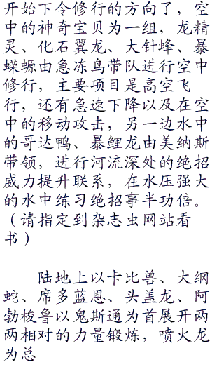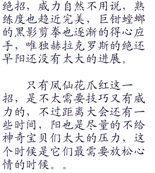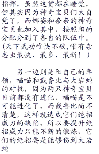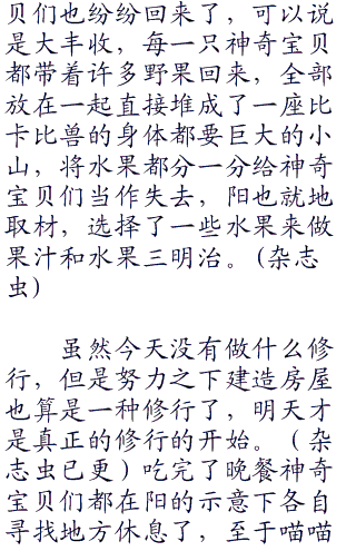 就这样花了一天的时间,在神奇宝贝们的努力下,终于完成了房屋的建造,接下来就是准备晚餐了,让神奇宝贝们各自分散开来,各自去寻找可以食用的食物,要知道这座山它们可比阳要熟悉的多了,平时都是在鬼斯通的带领下来到这里修行的,所以对这里的情况都很了解。