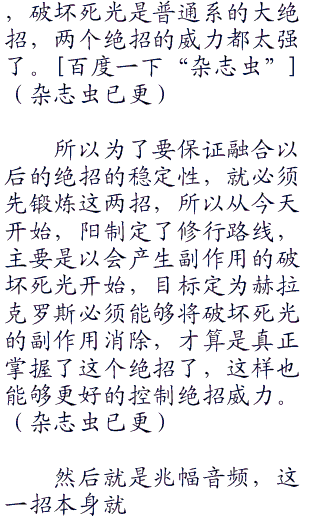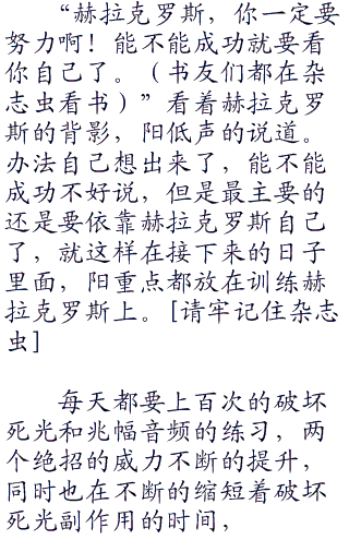 很简单,那就是不断的使用绝招,当然使用的绝招不是赫拉克罗斯没办法掌握的那一招,而是普通的破坏死光绝招。其实昨天晚上一晚上阳也没有想到什么太好的办法,所以只能按照自己的想法,来制定这个方法看看能不能成功了,简单来说,这是一种增加绝招熟练度的方式。
