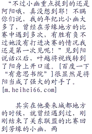 “嗯??原来你们认识小幽啊!”听到众人的对话以后,一旁的叶越也是开口说道。小幽也是芳缘地方的训练家,小幽来自水静市二叶越是来自未白镇两人虽然在的城市不同,不过却是认识的,在芳缘地方原先的比赛中也曾经那个遇到过,所以也是不错的朋友。