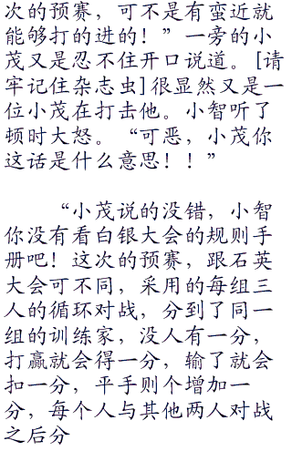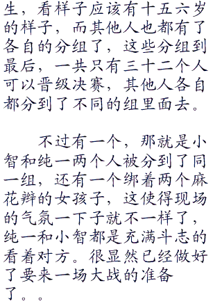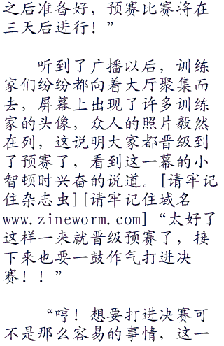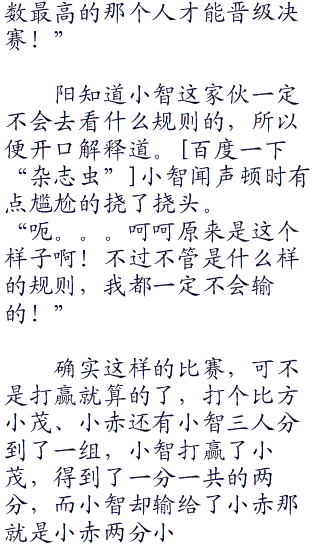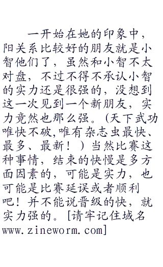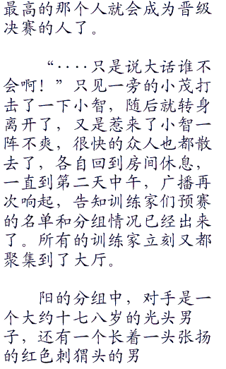 “师傅你回来了啊?接过怎么样了??”远远的就看着阳走了过来,奈奈立刻忍不住站起来问道。阳闻声耸了耸肩膀坐了下来,给自己叫了一杯饮料随后开口对着两人说道。“当然是赢了啊!一开始的比赛还是很轻松的,就是不知道其他人怎么样了!应该没问题吧!”