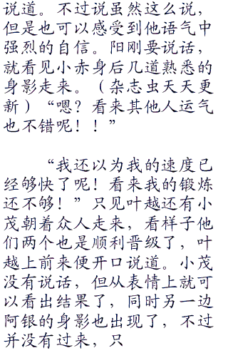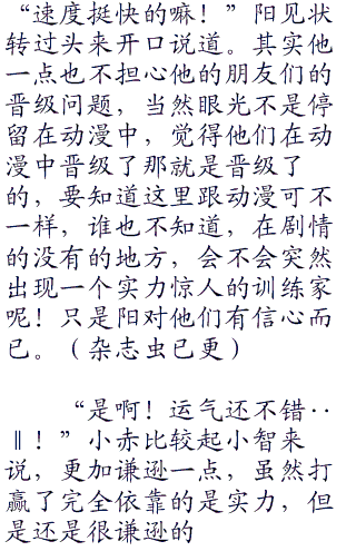“会晋级的可不止是阿阳哦!”只见两道熟悉的身影走来,一个是小赤一个是小音,小音是没参加的,不过让奈奈和娜姿惊讶的是,小赤竟然已经回来了,而且听他刚才的话应该是也已经晋级预赛了才对,没想到除了阳之外,小赤的速度竟然也那么快,尤其是奈奈。