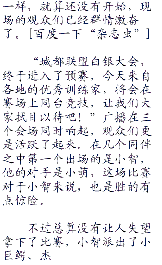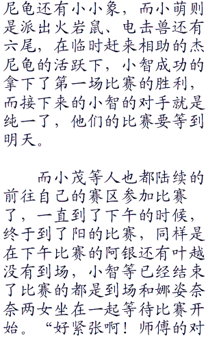通过了预选赛的选拔之后,海选之中,对手确定了,所有人都分到了不一样的队伍中,唯独小智和纯一分到了同一组当中,而且是比赛的第一天进行,所以小智和纯一两人都在尽力准备着,不过在他们一组的对抗之中,还有一个女孩子,小智的第一个对手是那个女孩子。