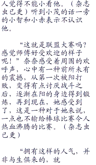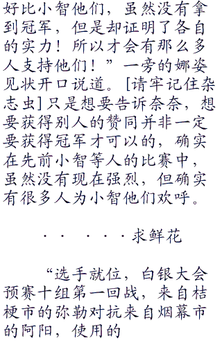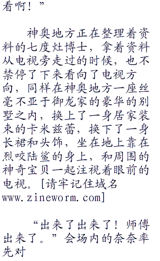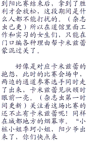 “可恶的家伙怎么还不出来!!”一边吃着薯片一边看着电视的卡米兹蕾正在抱怨着。跟往常一样,没错一到了阳的比赛的时候,她都会躲在房间里面等到看