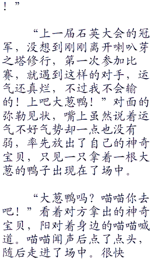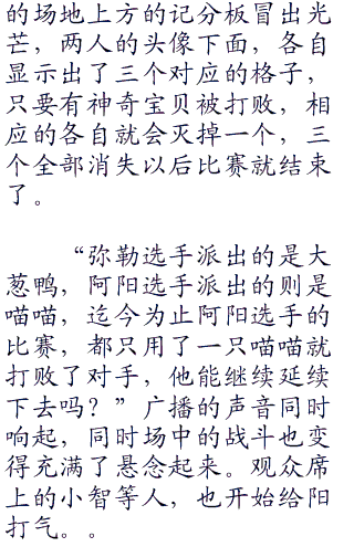 “呼。。。终于又骗走了一个!卡米真是的,每一次这种时候,我们都要帮她在这里应付挑战者!”看到那人离开后,两女才松了一口气。没办法,谁叫她们摊上了这么一个馆主呢?每次到了地区大会的时候,都会自己躲在房间里面吃着零食看着比赛,就好比现在。。。