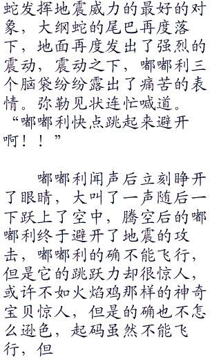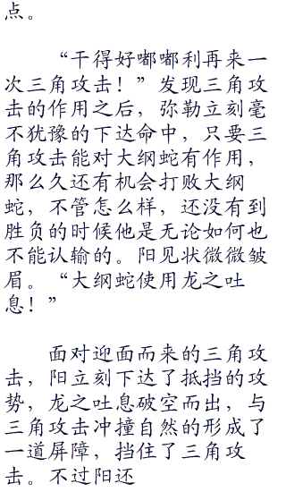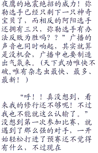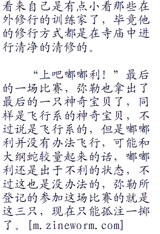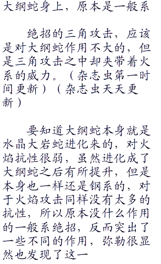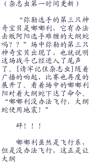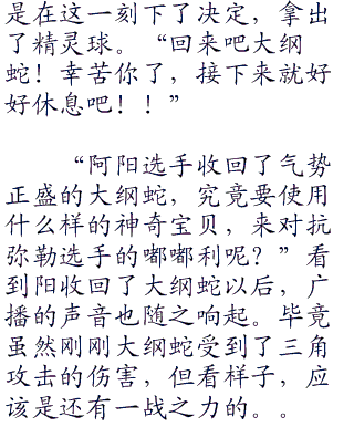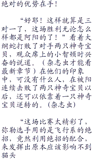 这样一来弥勒就只剩下最后的一个神奇宝贝了,而相比较下来,阳这边连带着场下的喵喵在内,还有着三只神奇宝贝,而且看着大纲蛇的样子,也没有消耗太多的体力可以说,这场比赛某种意义上胜负已分,因为阳这一边拥有着