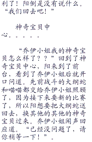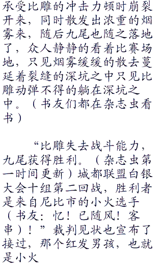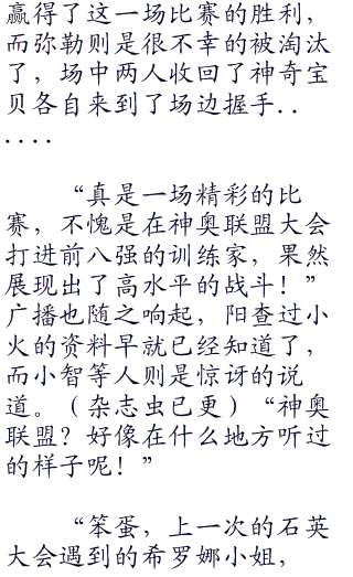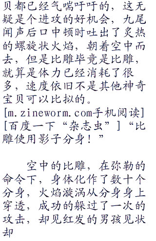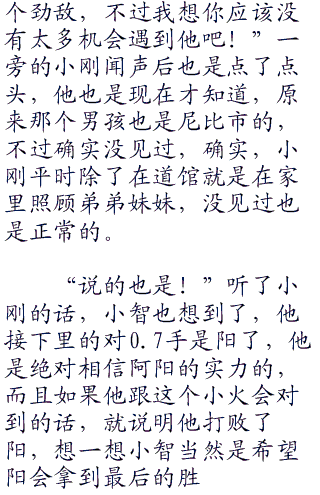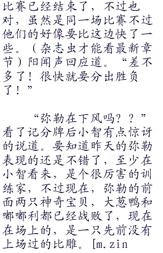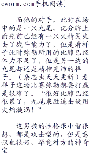 而阳所观看的,当然是和自己在同一组里面的两个对手,一边是已经交过手的弥勒,另一边是一个叫做小火的男孩,是一个纯正的使用火系的神奇宝贝训练家,一头张扬的火红色刺猬头,年纪比起自己打不“零零零”到哪里去,不过阳却还是很认真的观看他的战斗。