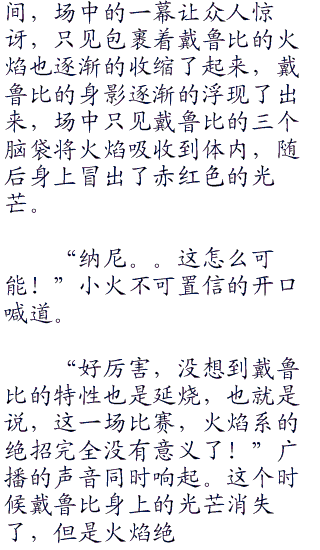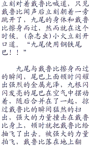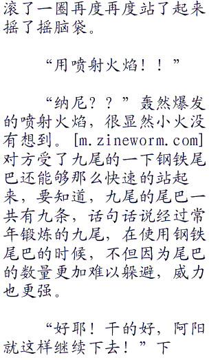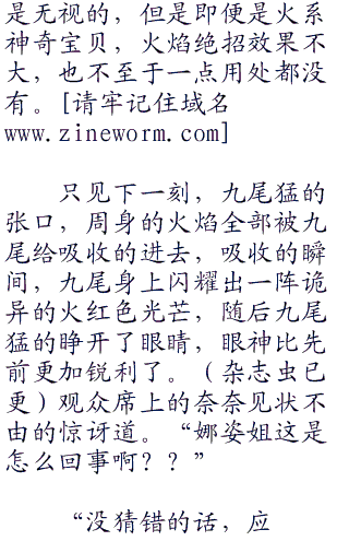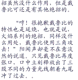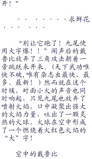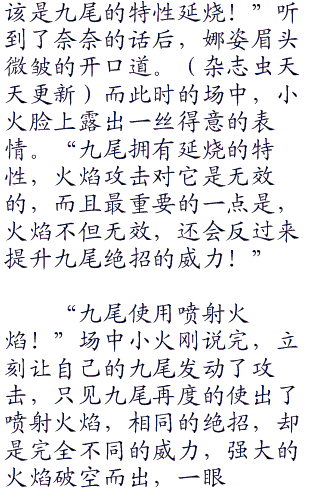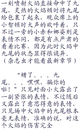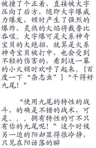 “喷射火焰爆发啦!绝招的威力几乎不分上下!”广播中传来了赞叹的声音,只见片刻之后,两股火焰同时消失了,两只神奇宝贝安然无恙。在绝招上面,两个神奇宝贝的威力几乎是一样的,也就是说,接下来比拼的就是身体的力量了。“九尾使用电光一闪!!”