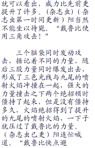 “喷射火焰吗?比火焰的话我们可是不会输的,九尾使用喷射火焰!”戴鲁比三个脑袋同时张口,三股火焰合并了起来朝着九尾冲了过去,而对面的九尾也没有躲避,口中同样吐出了炙热的火焰,场地中两股喷射火焰同时在空中碰撞,火焰顿时交融到了一起。