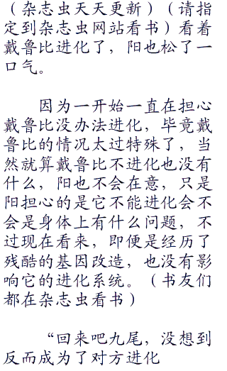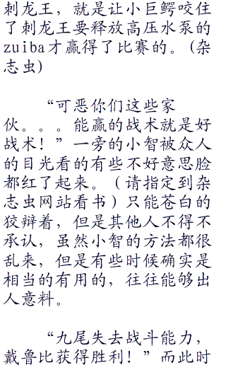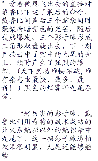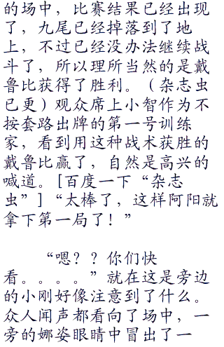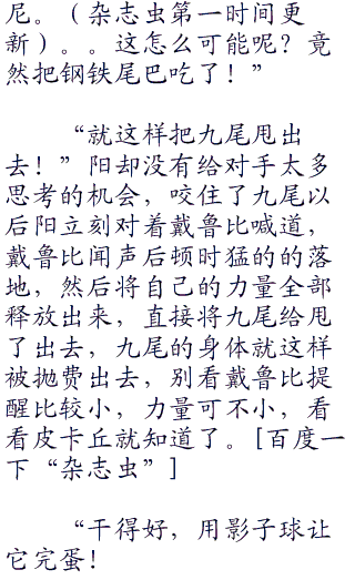 “戴鲁比躲开!!”阳见状一挥手,这一幕和一开始完全相似,戴鲁比避开了九尾的电光一闪,两只神奇宝贝擦身而过,小火见状双眼一凝,故技重施九尾的尾巴上再度闪耀出了金属光泽,九条尾巴再度并拢在一起。“早就知道你会来这一招,戴“零零零”鲁比使用咬碎!咬住那个钢铁尾巴!”