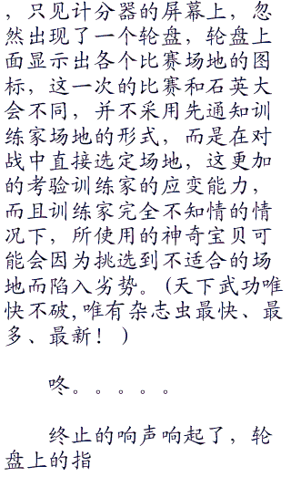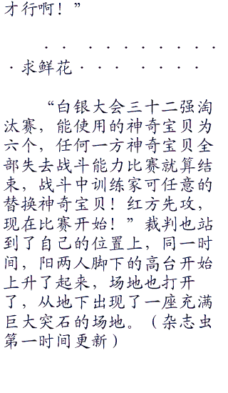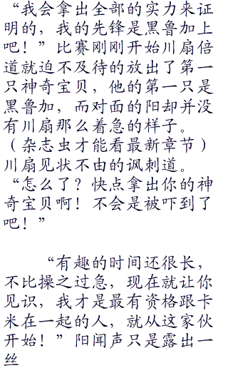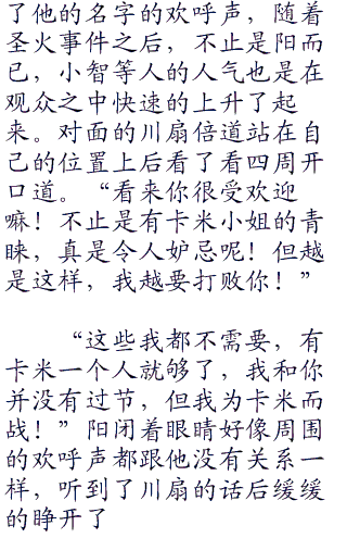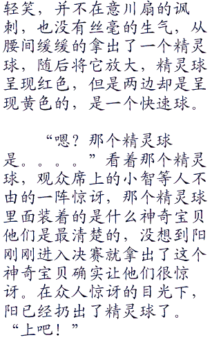 “等着瞧吧!”只见川扇放下了一句狠话之后就转身离开了,阳见状无奈的摇了摇头,随后就朝着另一边自己的休息室而去了,比赛马上就开始了,看着手中的六个精灵球,这是阳的习惯动作,每当比赛开始的时候,仿佛都能够感受到神奇宝贝们从各自的精灵球之中散发出来的兴奋和热血沸腾。