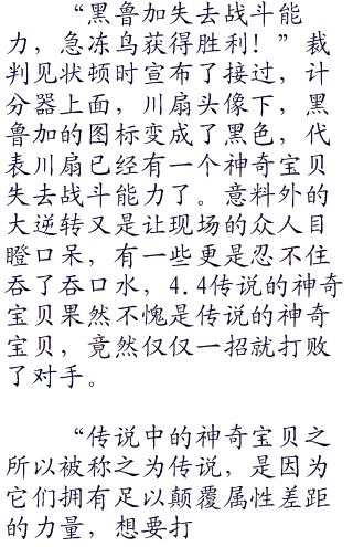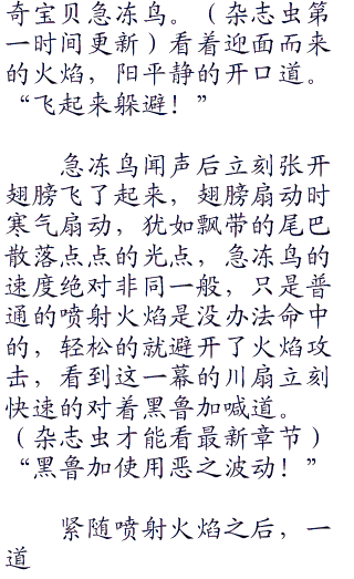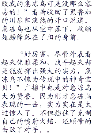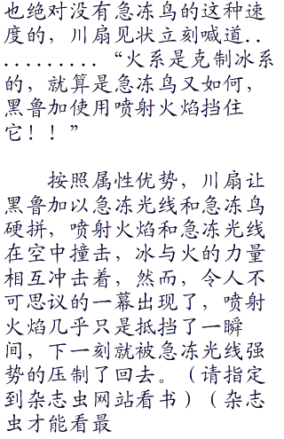 “可是就算你拿出的是传说中的神奇宝贝,我也不会认输的,在属性上还是我们有利的,黑鲁加使用喷射火焰!”尽管阳拿出了传说中的急冻鸟,但是为了一“零零零”个信念就跑到关东来挑战阳的训练家,也一样是不可能那么认输的,尽管急冻鸟实力很强,但是黑鲁加的属性是火系的,在属性上可以克制冰系的急冻鸟。