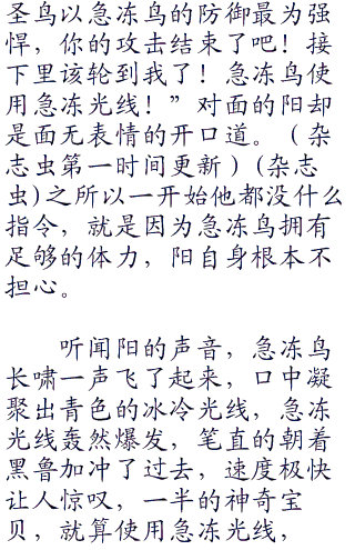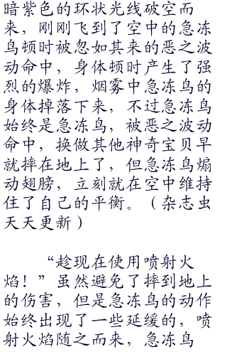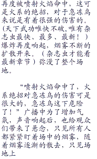 红方先攻,而川扇所在的就是红方,自然拥有率先出手的能力了,面对急冻鸟火系绝招效果是最明显的,喷射火焰强大的威力爆发出来,直接朝着急冻鸟的方向而去,但是要知道,眼前的可是传说中的神