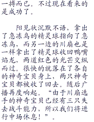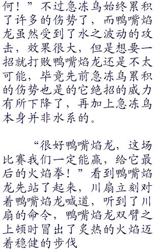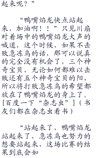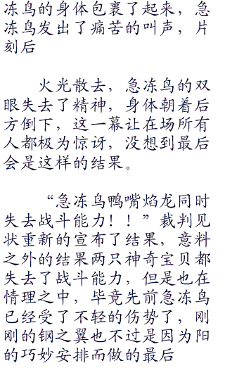 此时急冻鸟身上的火焰也散去了,此时的急冻鸟全身烧伤的躺在地上,而另一边的鸭嘴焰龙,也是在水之波动的力量消失以后从岩石上面掉落了下来。“看来那一击水之波动给了鸭嘴焰龙不小的伤害,急冻鸟看起来情况也不太乐观,到底谁能先站