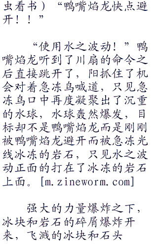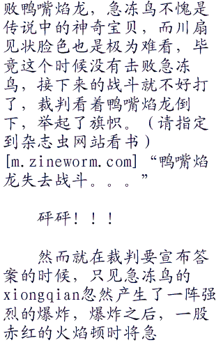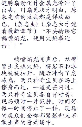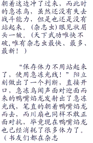 “命中了,急冻鸟在被大字爆命中的同时,竟然还能够进行反击,实在是太厉害了,鸭嘴焰龙看来受伤不轻,但急冻鸟也不好受!”刚刚那么精彩的一幕,令在场的所有人都感到了惊叹,许多观众反应过来以后,不由的后悔没有将这一幕拍下来。