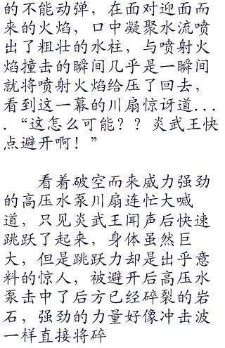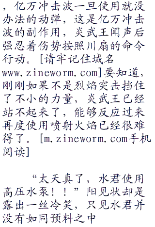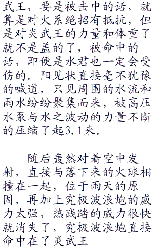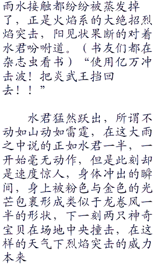 “炎武王使用喷射火焰!”先发制热的攻击,炎武王闻声后从鼻孔之中冒出炙热的热流,随后化作粗壮的火焰冲向了水君,阳没有下的任何的指令,水君也是站立原地不动,只见下一刻,喷射火焰直接命中了水君的身体,炙“零零零”热的火焰顿时将水君吞噬了进去。