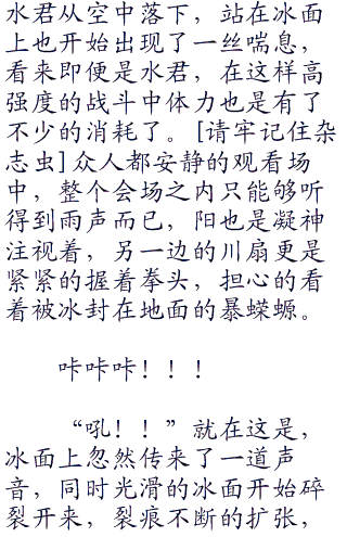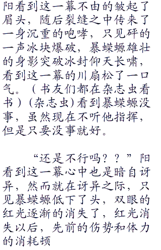 水君再度化作了粉色金边的风暴冲向了空中,暴蝾螈被极光束击中,虽然受了伤,但是在逆鳞状态下几乎等于没有痛楚,眼见水君的攻击再度袭来,扇动翅膀在空中一闪身,亿万冲击波的攻击从暴蝾螈身边擦身而过。暴蝾螈避开了水君,口中立刻再度凝聚破坏死光的光芒,随的猛然转身。