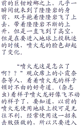 喷火龙闻声后立刻飞到了空中去,地震只能在地面进行攻击,所以喷火龙只要飞到了空中一切的攻击就自动消失了,而飞到了空中的喷火龙拥有空中的优势,但是喷火龙的绝招里面,没有太多对隆隆岩有作用的,对岩石系有作用的当然是格斗系。“喷火龙抱住隆隆岩飞上去!”