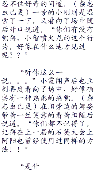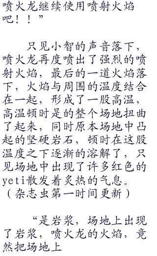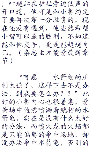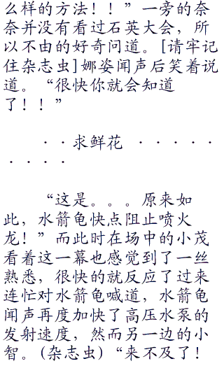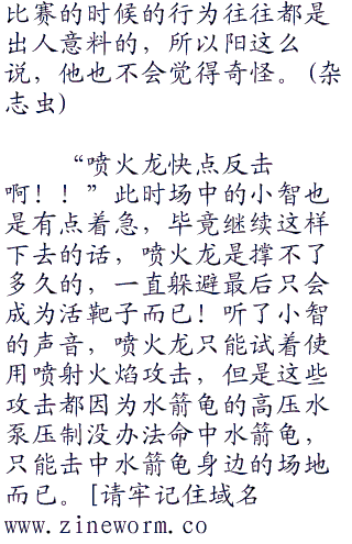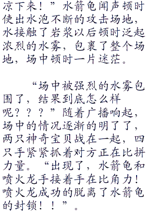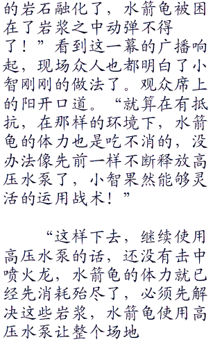 “水箭龟连续使用高压水泵封锁喷火龙的行动!!”喷火龙飞翔到了空中,但小茂却抓住了机会,水箭龟在地面,不断的对着空中发射高压水泵,一道道粗壮的水柱飞向空中,喷火龙只能不断的躲避着攻击,以它现在的状态,再被高压水泵击中一次的话就危险了。