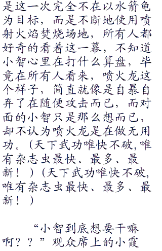 而水箭龟的攻击速度也很惊人,喷火龙只能不但的在空中盘旋着躲避攻击否则的话,一个不留神就会被命中,高压水泵就像是变成了一张天罗地网一样,观众席上,看着比赛的小赤说道。“这场比赛的节奏,似乎逐渐的被小茂掌握了,小智有点危险了!”