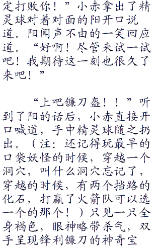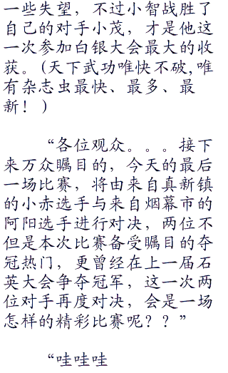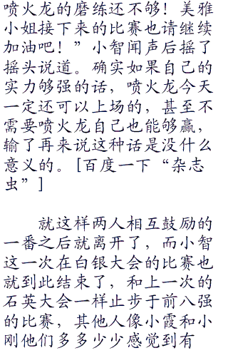 今天的比赛,阿银的比赛最先开始,秉持一贯的作风,战斗的时候全力以赴的阿银,表现出了超水平的实力,轻易的击败了对手,成功的晋级到了,而接下来进行的是另一场比赛,两个训练家表现的也还算是精彩,再来就到了小智的比赛了。