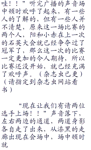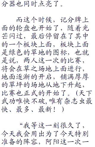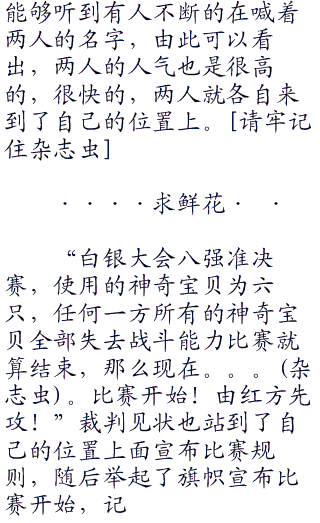 “白银大会八强准决赛展开了,一路行至这一步的优秀训练家们,能够有怎样精彩的表现呢?”第二天比赛正式的开始了,八强赛对于训练家们来说是很重要的,要是能进入四强半决赛就能够有机会进入前三甲的争夺,所以这也是一场至关重要的比赛,不能够大意的比赛。
