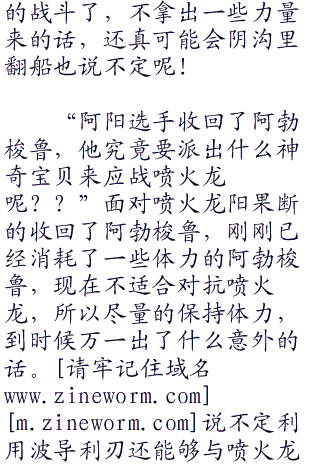 “原来如此,一来就要全力以赴未免有点太着急了,不过我也没理由不接下来了!回来吧阿勃梭鲁!”阳见状笑着说道。毕竟小赤派出了喷火龙了,换句话说现在就要开始真正
