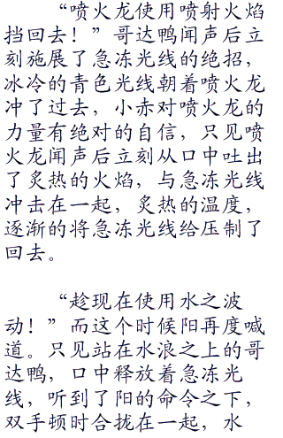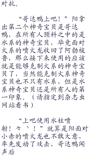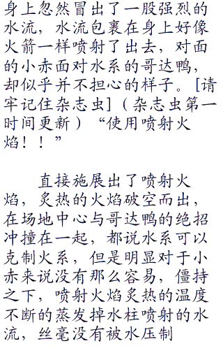 意料之外的小赤,第二个就拿出了自己的喷火龙,作为小赤的王牌,这只喷火龙在上一次石英大会上面可是表现的相当出色呢!不过小赤也不像是一个会乱来的人,可以看出,拿出喷火龙来应该是有其他的用意才对。“搞不好小赤是想要在这里就先将比分拉开,所以才提前拿出了喷火龙的!”