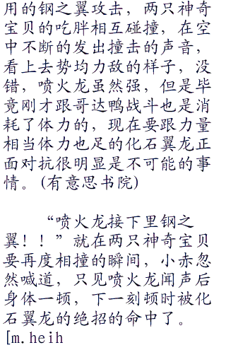 喷火龙烈焰突击猛的爆发,周围飞溅过来的冰块碎片顿时被炙热的能量燃烧殆尽,下一刻喷火龙带着一股蓝色的火焰破空而出,两只神奇宝贝一上一下强势的撞击在一起,碰撞的中心形成了一股强大的蒸汽,然而在对抗片刻之后,喷火龙大吼一声,烈焰突击的威力瞬间增强,直接将哥达鸭的力量压制了回去。