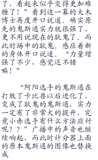 “啊。。。对手实在难缠了一些,接下来就交给你了!”阳闻声后对着鬼斯通开口说道。在阳的所有神奇宝贝里面,与其说鬼斯通阳的神奇宝贝,不如说它是给阳传授这个世界以往知识的老师,同时也是阳其他神奇宝贝的教官,再加上可以说话,交流上更加方便。
