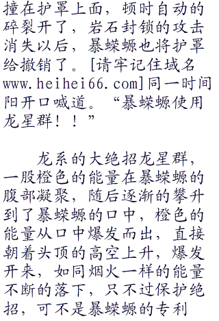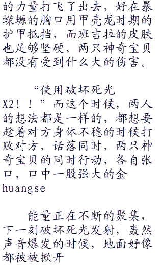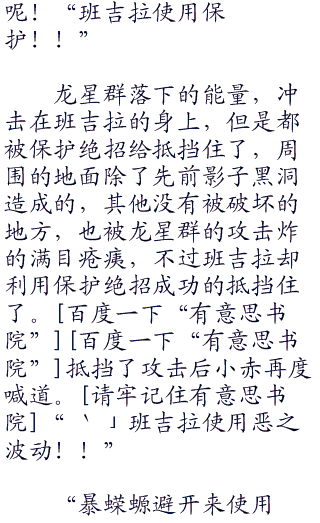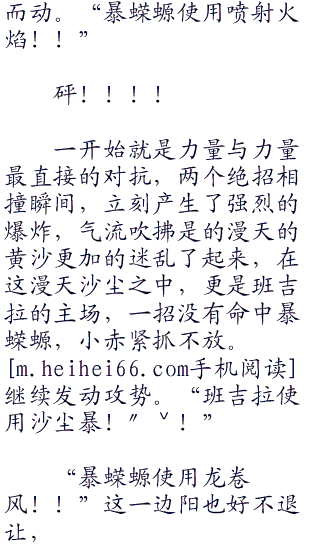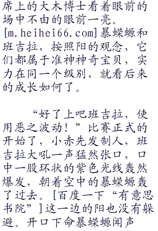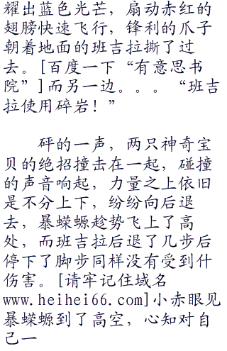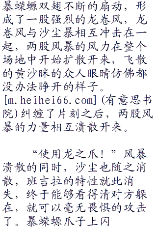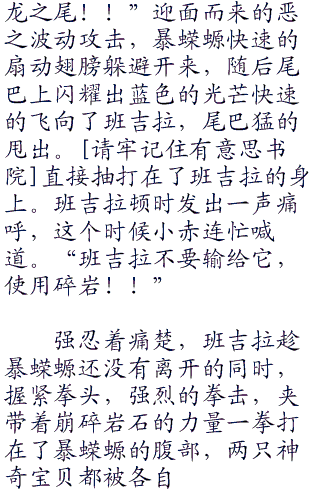 “交给你了上吧!!”阳也拿出了一个新的精灵球了,仔细看的话就可以发现这个精灵球并不是阿勃梭鲁的,一阵光芒出现在沙尘之中,光芒中散发出一阵吼叫声,翅膀逐渐张开,身体逐渐的出现在众人眼前,蓝色的身体,血红色的翅膀,散发着龙系神奇宝贝独有的气势暴蝾螈登场了。