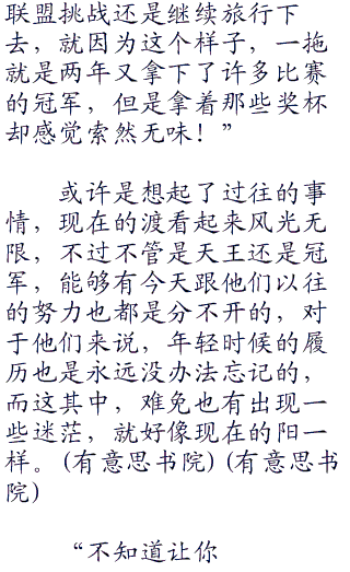 “你知道嘛?在我离开神奇宝贝学院之后,也跟你一样,在外学习到以后,战无不胜连续取得了许多比赛的优胜,09但是。。。一直到最后我也开始迷茫了起来,我是应该向